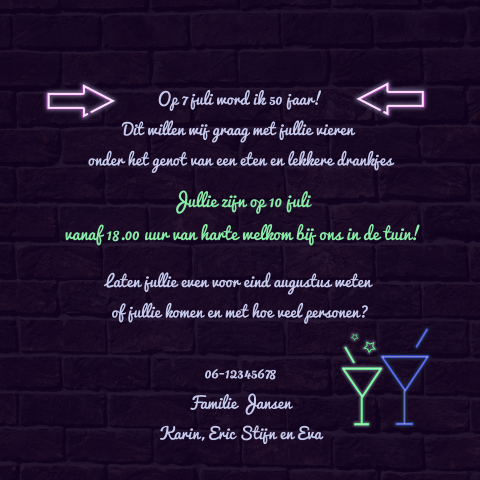 Uitnodiging party 50ste verjaardag met cocktail en neon kleuren