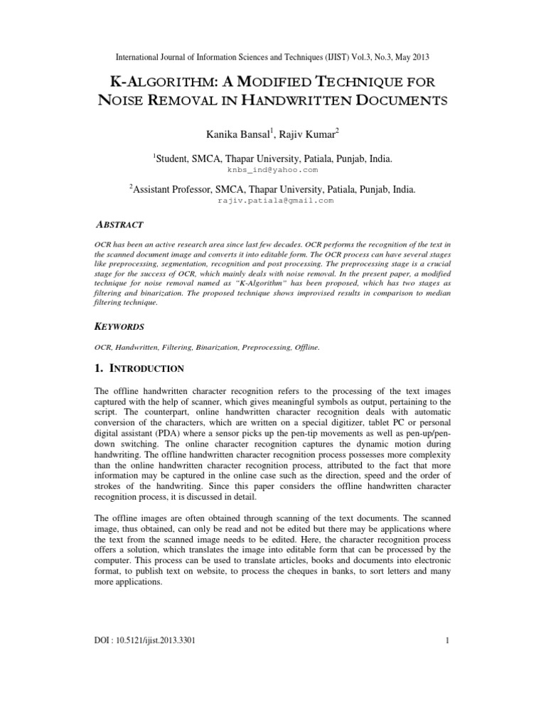 K-ALGORITHM: A MODIFIED TECHNIQUE FOR NOISE REMOVAL IN HANDWRITTEN DOCUMENTS | Optical Character Recognition | Image Scanner